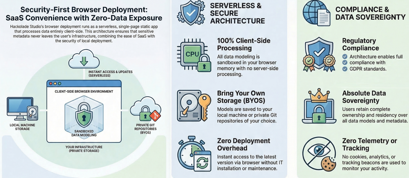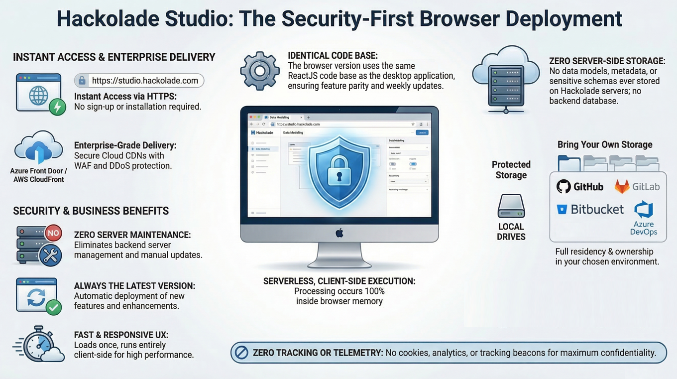 This serverless setup gives you full control of the residency for your data models, while leveraging the benefits of an online application. In other words, the Hackolade Studio online application runs without any kind of backend system or database. We don't host the application. We publish it on a Content Delivery Network like Azure Front Door or AWS CloudFront, while you continue to maintain your data models locally, as you would do with the offline desktop deployment of Hackolade Studio. The app runs entirely client-side in the browser, but securely -- with no backend server, either on the customer side or on the Hackolade side. No server-side processing -- everything takes place inside your browser.